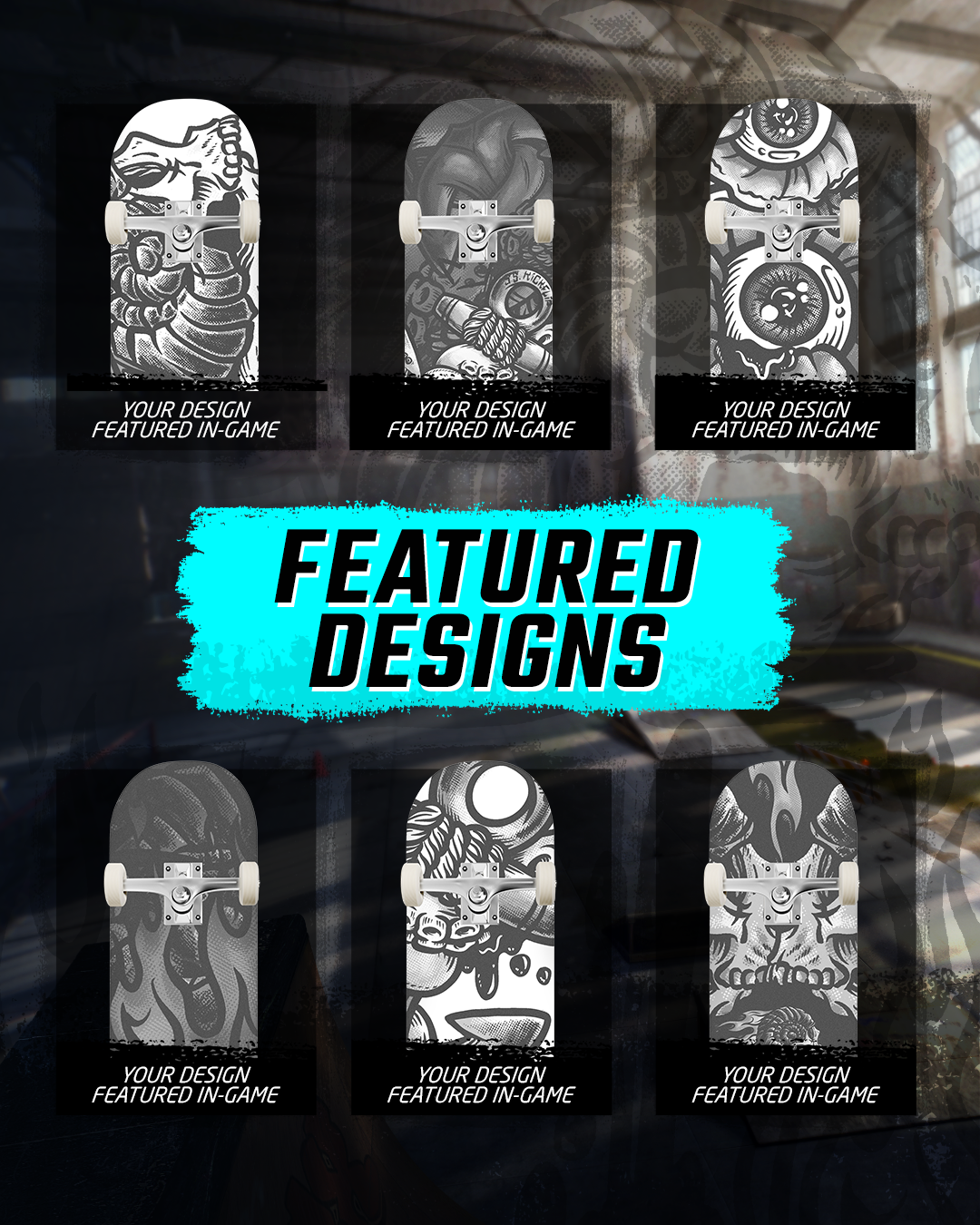 Our team created supporting graphics for Tony Hawk's video game social media page. Everything ranging from Skater's birthday shoutouts, awards for the game, Skater bios, weekly giveaway contests and more. The duration of our support lasted about 2 years after the games' initial release which garner interest from fans and newbies alike. To keep the campaign cohesive, the team researched the game and pulled various screenshots and textures to ensure 100% authenticity and relatability. Some textures and illustrations were even created from scratch by multiple talented artists on our team.