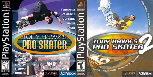 Second: Original Neversoft x Activision Tony Hawk's Pro Skater and Pro Skater 2 packshots from the initial PlayStation™ release. These original keyart files were primarily flat and limited in it's customization. Since then, the team has adapted to a more flexible keyart approach to ensure multiple marketing assets across the board were not hindered (file size, dpi, color mode, etc.)