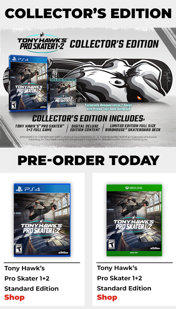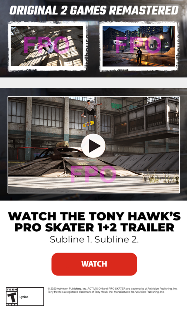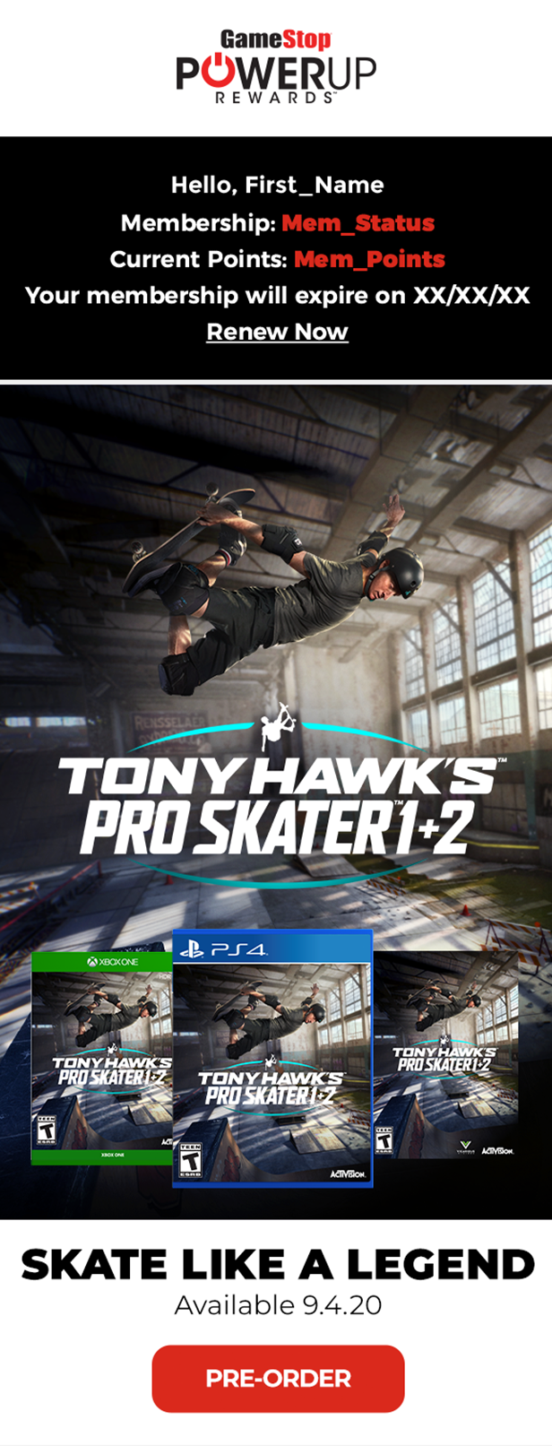 Further in-game (Call of Duty) and web (GameStop.com) promotions for upgraded game versions, physical products, in-game character skins and more. Our team collaborated with the marketing team for Tony Hawk in conjunction with GameStop to ensure the marketing messages were clear and concise.