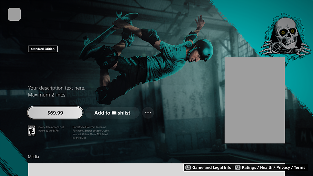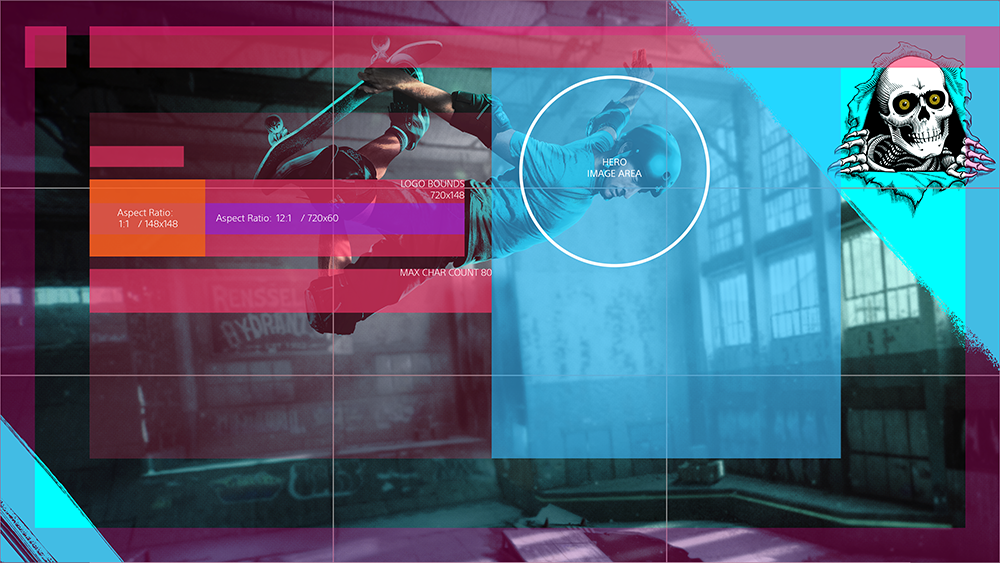 PlayStation™ dashboard graphics that work in tandem with their predetermined UI. Templates for graphic placement were provided by Sony directly to ensure cohesion across the console's dynamic dashboard branding. Prices, descriptions, logos and video placement are taken into consideration to ensure game keyart remains unobstructed from consumer view. First: IP keyart without safe-areas obstructing your view. Second: Sony-approved safe area placements of UI and marketing elements that may obstruct key art. Last: A mock-up overview of how the key art will be displayed within the PlayStation™ dashboard.