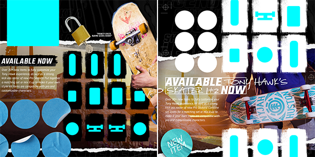 Social concepts and promotional items to aid in showcasing the range of items available for players. Conception of marketing ideas within our team ranged from 1 month to 1 day depending on the urgency of the item or mode we were trying to promote. This meant further in-game research and thinking quickly on our feet to provide the best possible options that still felt as though they were in-brand and part of the game. Many assets for the Tony Hawk IP were created by the team and myself (shown above) in order to meet the demands of the game's short marketing timelines.
